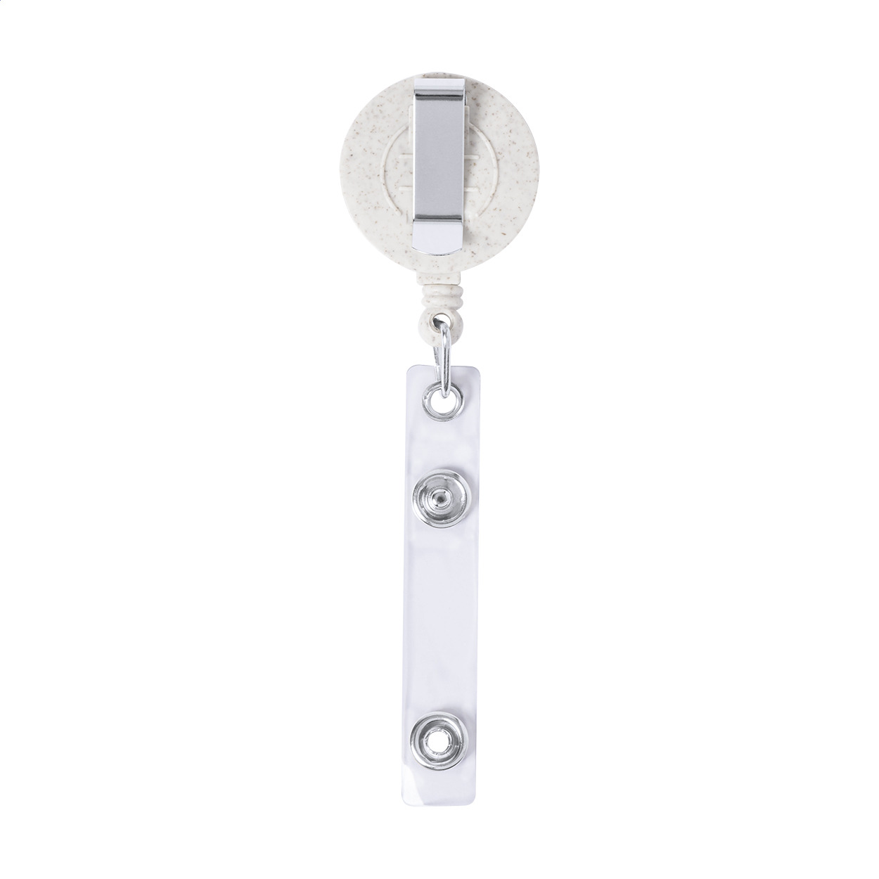 Porte-badge en plastique et bambou écologique en paille de blé avec fermeture par bouton pression, dérouleur et clip en métal.